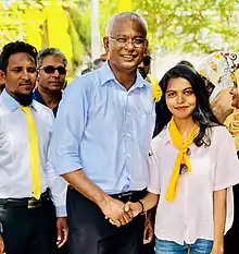 |CitationClass=تم تجاهله (مساعدة) - "Ibrahim Mohamed Solih". Maldivian Democratic Party. مؤرشف من الأصل في 24 ديسمبر 2018. اطلع عليه بتاريخ 24 سبتمبر 2018. الوسيط