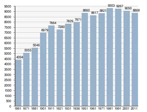 في سنة 1861 بلغ عدد السكان 4٬394 نسمة، وتطور العدد ليصل في سنة 2011 لـ 8٬868 نسمة.