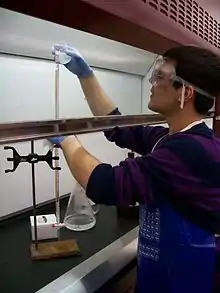 - المواد الكيميائية السامة غير المعروف درجة سميتها لا يجب شمها على الإطلاق. والمواد الكيميائية المتطايرة والسامة أو المواد الصلبة والسائلة السامة يجب التعامل معها في خزانة التجارب [Laboratory hood].