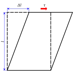يظهر الشكل إجهاد القص الناتج عن تطبيق قوة ما، يظهر إجهاد القص على الضلع العلوي لمقطع عرضي على شكل مربع، في حين أن الضلع السفلي ثابت. يؤدي هذا الإجهاد إلى انزياح في الضلع العلوي