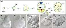 في دراسة أجريت في عام 2008 من النبات رشاد أذن الفأر '، تم توثيق هجرة النوى الذكرية داخل الأمشاج الأنثوية، في الاندماج مع الأنوية الأنثوية، لأول مرة باستخدام في الجسم الحي التصوير. كما تم تحديد بعض الجينات المشاركة في عملية الهجرة والدمج.[2]