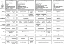 يمر مشروع التشييد ب 5 مراحل رئيسية وهي مرحلة الجدوى ثم مرحلة التصميم ثم مرحلة ما قبل التشييد ثم مرحلة التشييد ثم مرحلة التشغيل والصيانة [3]