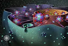 دخول المواد إلى نواة من خلال الالتقام. ويسافر الجسيم البلعمي من غشاء الخلية إلى النواة، ومن ثم من يلتقم من قبل نواة، ويخرج محتوياته.