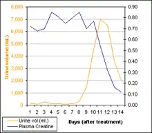 إن آليات ارتشاف الكلى تكون نشطة بشكل خاص، حيث تستخدم ما يقرب من 100 ٪ من الأكسجين O2 المزود لها. وبالتالي، فإن الكلى حساسة بشكل خاص لانخفاض تدفق الدم. تحدث هذه الظاهرة بسبب استعادة التدفق الكلوي قبل وظيفة الارتشاف الطبيعية للنبيبات الكلوية. كما يظهر في الرسم البياني أدناه، فإن تدفق البول يتعافى بسرعة وبالتالي يتجاوز الناتج اليومي المعتاد (بين 800 مل و 2 لتر في معظم الناس). نظرًا لأن قدرة ارتشاف الكلى تستغرق وقتًا أطول، فهناك تأخر بسيط في الوظيفة يتبع استعادة التدفق. يتراوح المجال المرجعي الجيد لكرياتينين البلازما بين 0.07 - 0.12 مليمول / لتر.