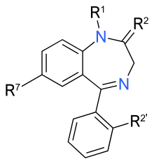 ![]() البنية الأساسية للبنزوديازيبينات. العلامات "R" للدلالة على المواقع المشتركة للسلاسل الجانبية، والتي تعطي البنزوديازيبينات المختلفة خصائصها الفريدة. |