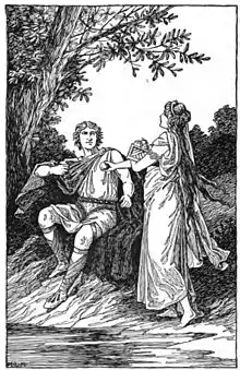 تروي إيدا النثرية أن العملاق ثيازي أجبر الإله لوكي في إحدى المرات على إغراء إدون لتخرج من أرض أسكارد إلى إحدى الغابات، حيث وعدها بثمار تفاح جميلة. تحول ثيازي إلى شكل نسر، وخطف إدون من الغابة وأخذها إلى بيته. بدأت الآلهة تشيخ وتشيب بسبب غياب إدون، وأدركوا أن لوكي هو المسؤول عن اختفائها. وعد لوكي بأن يعيدها، وتحول إلى شكل صقر، ووجدها وحدها في بيت ثيازي. ثم حولها إلى حبة جوز وعاد بها إلى أسكارد. أدرك ثيازي أن إدون قد اختفت، فتحول إلى نسر وظل يطارد لوكي بشراسة. بنى الآلهة محرقة في أسكارد، وبعد أن توقف لوكي فجأة، اشتعلت النيران في ريش ثيازي ووقع، فقامت الآلهة بقتله.