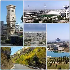 ![]() من يمين الأعلى باتجاه عكس عقارب الساعة: ملعب الحسن، برج الساعة في مركز المدينة (وسط اربد)، صورة من ريف إربد، جامعة العلوم والتكنولوجيا الأردنية، وفي الوسط صورة للمدينة. | |||
