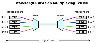 يستخدم نظام WDM معدد إرسال multiplexer عند المرسلtransmitter لربط الإشارات المتعددة معًا ومزيل تعدد الإرسال عند جهاز الاستقبال لتقسيمها عن بعضها البعض. مع النوع الصحيح من الألياف ، من الممكن أن يكون لديك جهاز يقوم في وقت واحد ويمكنه أن يعمل كمضاعف ضوئي للإسقاط الإضافي optical add-drop multiplexer. كانت أجهزة التصفية البصريةoptical filtering devices المستخدمة تقليديًا إيتالون etalons( مقاييس تداخل فابري-بيروت Fabry–Pérot interferometersالثابتة ذات الحالة الصلبة المستقرة في شكل زجاج بصري مغلف بغشاء رقيق). نظرًا لوجود ثلاثة أنواع مختلفة من WDM، حيث يُطلق على أحدها اسم "WDM" ، يتم استخدام الترميز "xWDM" عادةً عند مناقشة التكنولوجيا على هذا النحو.