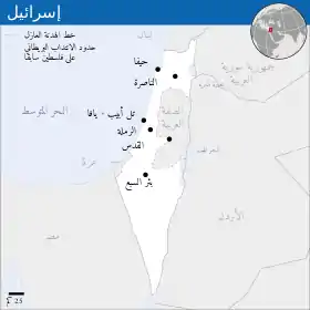 إسرائيل (بالعبرية: יִשְרָאֵל، يِسْرائيل)، ورسميًا "دولة" إسرائيل (بالعبرية: מְדִינַת יִשְרָאֵל؛ مِدينات يِسْرائيل)، هي دولة تقع في غرب آسيا، وتقع على الساحل الجنوبي الشرقي للبحر الأبيض المتوسط والساحل الشمالي للبحر الأحمر. لها حدود برية مع لبنان من الشمال، وسوريا من الشمال الشرقي، والأردن من الشرق، والأراضي الفلسطينية في الضفة الغربية وقطاع غزة من الشرق والغرب،[19] على التوالي، ومصر من الجنوب الغربي. تحتوي البلاد على ميزات متنوعة جغرافيا داخل مساحتها الصغيرة نسبياً.[20][21] مركز إسرائيل الاقتصادي والتكنولوجي يقع في مدينة تل أبيب،[22] في حين أن مقر حكومتها والعاصمة المعلنة هي القدس، على الرغم من أن سيادة الدولة على القدس لديها اعتراف جزئي فقط.[23][24][25][26]