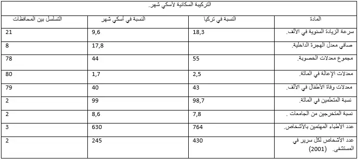 ظهر ارتفاع كبير في عدد السكان نتيجة هجرة السكان من بلغاريا إلى إسكي شهر والاستقرار فيها خصوصا في الفترة التي ما بين أعوام 1950- و 1955 وأيضا الفترة ما بين أعوام 1965- و 1970 . وفي عام 1950 كان عدد السكان 210 ألف نسمة ووصل في عام 1960 إلى 553 ألف نسمة. وفي عام 1970 كان عدد السكان 786 ألف نسمة ووصل في عام 1980 إلى 912 ألف نسمة. وفي عام 1990 كان العدد 1,3 مليون نسمة ووصل في 2010 إلي مليون ونصف المليون.[28] وفقاً لنظام تسجيل السكان فإن عدد سكان المحافظة في عام 2009 وصل إلى 1.655,427 نسمة. وعدد السكان في مركز المحافظة هو 1.517.215 نسمة، وباقي المناطق والقري الأخرى يبلغ عددهم 138.212 نسمة. وتبلغ نسبة السكان في المدن 82% أما في القرى فتبلغ 18%.[29] ونسبة زيادة معدل النمو السكاني السنوية في المحافظة 13,61 في الألف، حيث يزيد المعدل السكاني في المدينة بنسبة 21,41 في الألف وتبلغ في القري 9,52 في الألف. وعند النظر إلي معلومات عدد السكان نجد أن نسبة الهجرة من القرية إلي المدينة في ازدياد. وتبلغ كثافة السكان في العام 65 نسمة وترتفع في مركز المدينة لتصل إلى 495 نسمة.[30] ووفقا لتقرير الأمم المتحدة فإن إسكي شهر تأتي في المرتبة الثانية من ناحيه حسن المعيشة.[31]