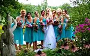 إشبينة العروس مع العروس وكما يظهر في الصورة يلبسن زي موحد.