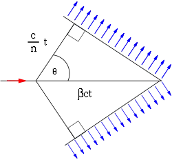 كما في الصورة الموضحة، يسير الجسيم (السهم الأحمر) في وسط بسرعة حيث حيث أنا سرعة الضوء في الخلاء. و هو مؤشر كسر الأشعة للوسط، حيث أن مؤشر كسر الأشعة في الماء يساوي 1.33 في درجة الحرارة 20°. كما نعرف النسبة بين سرعة الجسيم وسرعة الضوء بـ . موجات الضوء المنبعثة (الأسهم الزرقاء) تسير بسرعة . الزاوية اليسارية للمثلث تمثل مكان الجسيم الفوق ضوئي في اللحظة البدائية (t=0). والزاوية اليمينية للمثلث هي مكان الجسيم في وقت آخر t، في الوقت المعلوم t الجسيم يسير مسافة: