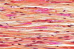 ![]() صورة مجهرية لعصب يظهر عليه انخفاض في نسبة مادة الميالين (اللون الوردي) مع زيادة غير طبيعية في نسبة النسيج الليفي (اللون الأصفر) والذي يحدث في حالات إصابة العصب HPS stain. صورة مجهرية لعصب يظهر عليه انخفاض في نسبة مادة الميالين (اللون الوردي) مع زيادة غير طبيعية في نسبة النسيج الليفي (اللون الأصفر) والذي يحدث في حالات إصابة العصب HPS stain. | |