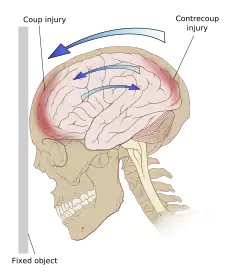 قد تحدث الأضرار مباشرة تحت موقع الصدمة، أو قد تحدث على الجانب المقابل لها (إصابة الضربة ورجع الضربة على التوالي).[59] فعندما يؤثر جسم متحرك على الرأس الثابت، تكون إصابات الضربة نموذجية،[61] في حين أن إصابات رجع الضربة تنتج عادة عندما يضرب الرأس المتحرك جسم ثابت.[62]