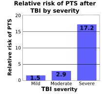 وتشمل اضطرابات الحركة التي قد تتطور بعد الإصابة الدماغية الرضية: الرعاش، والرنح (حركات العضلات غير المنسقة)، والرمع العضلي (تقلصات تشبه الصدمة في العضلات)، وفقدان نطاق الحركة والسيطرة.[84] ويزداد خطر الصرع التالي للرض مع شدة الرضة (الصورة في اليسار) ويزداد بشكل خاص مع أنواع معينة من صدمات الدماغ مثل الكدمات الدماغية أو الورم الدموي.[107] الأشخاص الذين يعانون من التشنجات المبكرة، تلك التي تحدث في غضون أسبوع من الإصابة، لديهم خطر متزايد من الصرع التالي للرضة (النوبات المتكررة التي تحدث بعد أكثر من أسبوع من الصدمة الأولية).[116] كما قد يفقد أو يعاني المصابون من تغير البصر أو السمع أو الشم.[3]