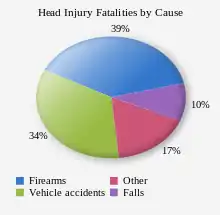 وتسهم العوامل البيولوجية، والسريرية، والديموغرافية في احتمالية أن تكون الإصابة مميتة.[132] وبالإضافة إلى ذلك، تعتمد النتيجة بشكل كبير على سبب إصابة الرأس. ففي الولايات المتحدة، يكون معدل البقاء على قيد الحياة للمرضى الذين يعانون من إصابات الدماغ الرضية المرتبطة بالسقوط 89٪، في حين أن 9٪ فقط من المرضى الذين يعانون من الإصابة المرتبطة بالأسلحة النارية يستطيعون البقاء على قيد الحياة.[138] الأسلحة النارية هي السبب الأكثر شيوعًا للإصابات الدماغية الرضية المميتة في الولايات المتحدة، تليها حوادث المركبات، ثم السقوط.[132] ويعتبر 75٪ من بين الوفيات الناجمة عن الأسلحة النارية هي حالات انتحار.[132]