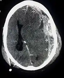 تعرف إصابات الدماغ الرضية بأنها ضرر للدماغ ناجم عن قوة ميكانيكية خارجية، مثل التسارع أو التباطؤ، أو الصدمة، أو الانفجار، أو الاختراق بواسطة قذيفة.[2] وتصاب وظيفة الدماغ بخلل بشكل مؤقت أو دائم، وقد يمكن أو لا يمكن كشف الضرر الهيكلي مع التكنولوجيا الحالية.[3]