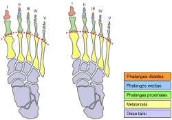 موقع المفصل. السطح الظهري لقدم يمني بإصبع قدم مورتون (الصورة اليسري) وبدون (الصورة اليمني). تسيلط الضوء على الخط المتقطع
