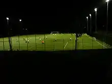 ساحة ملعب كرة قدم مضاء بالأضواء الغامرة.