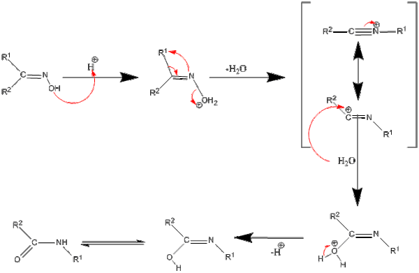 إن آلية التفاعل الأكثر شيوعًا لإعادة ترتيب بيكمان تتكون بشكل عام من هجرة الالكيل بالاتجاه المعاكس لتشكيل ايون النيترليوم يتبع ذلك تحوله إلى ايميد ومن ثم إلى اميد