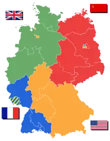 بعد انتهاء الحرب العالمية الثانية في أوروبا، كانت ألمانيا قد قسمت إلى أربع مناطق محتلة. وكذلك، فقد قسمت العاصمة السابقة برلين، والتي كانت مقر مجلس تحكم الحلفاء، إلى أربعة أقسام هي الأخرى. كانت الخطة في البداية أن تحكم ألمانيا من قبل قوى الاحتلال من عام 1947 م، إلا أن التوتر الذي نتج عن الحرب الباردة جعل المناطق الخاضعة للسيطرة الفرنسية والبريطانية والأمريكية أن تتحد لتكون الجمهورية الألمانية الفيدرالية والتي احتوت أيضا على غرب برلين، وذلك في عام 1949 م. وبالمقابل، فقد تحولت في نفس العام منطقة الاتحاد السوفياتي إلى جمهورية ألمانيا الديمقراطية بما في ذلك شرق برلين. وبالإضافة، وحسب الشروط المتفق عليها في مؤتمر يالطا في فبراير 1945 م، فقد ضمت مقاطعتا بوميرانيا وسيلسيا الشرقيتان وضم النصف الجنوبي من مقاطعة شرق بروسيا، ما يعرف اليوم باسم أوبلاست كاليننغراد، إلى الاتحاد السوفياتي.