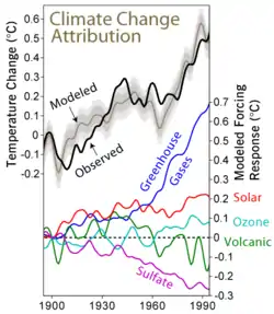 - Hegerl, G. C.; Zwiers, F. W.; Braconnot, P.; Gillett, N.P.; Luo, Y.; Marengo Orsini, J.A.; Nicholls, N.; Penner, J.E.; Stott, P.A. (2007). "Chapter 9, Understanding and Attributing Climate Change – Section 9.2.2 Spatial and Temporal Patterns of the Response to Different Forcings and their Uncertainties". In Marquis, M.; Qin, D.; Manning, M.; Chen, Z.; Miller, H.L. (المحررون). Climate Change 2007: The Physical Science Basis. Contribution of Working Group I to the Fourth Assessment Report of the Intergovernmental Panel on Climate Change. Cambridge, United Kingdom and New York City: Cambridge University Press. مؤرشف من الأصل (PDF) في 23 نوفمبر 2018. اطلع عليه بتاريخ 13 أبريل 2008.