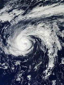 ![]() صورة الأقمار الصناعية لإعصار نادين. باتجاه الوسط تبدو العين الصغيرة الباهتة مرئية. تمتد أيضا الشرائط اللولبية الطويلة إلى الشرق. | |