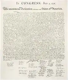 إعلان الاستقلال الأمريكي أو إعلان استقلال الولايات المتحدة (بالإنجليزية: United States Declaration of Independence) هو وثيقة تبناها الكونغرس القاري في 4 يوليو 1776، لتعلن أن المستعمرات الأمريكية الثلاثة عشر المتحاربة مع بريطانيا العظمى قد أصبحت ولايات مستقلة، وبالتالي لم تعد جزءًا من الإمبراطورية البريطانية. مكتوب بشكل رئيسي بواسطة توماس جفرسون، يعتبر الإعلان تفسيرا رسميا لأسباب تصويت الكونغرس في 2 يوليو لصالح إعلان الاستقلال عن بريطانيا العظمى، بعد مرور أكثر من عام على اندلاع حرب الاستقلال الأمريكية. عيد ميلاد الولايات المتحدة -يوم الاستقلال- يحتفل به في 4 يوليو، يوم اعتماد الكونغرس صيغة الإعلان.