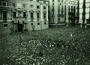 بعد الفوز الساحق ليسار كتالونيا الجمهوري في الانتخابات البلدية في 12 أبريل (في 25 عضوًا في برشلونة مقابل 12 من الرابطة الإقليمية و12 من مرشحي الجمهوري-الاشتراكي) قام لويس كومبنيس أحد قادة يسار كتالونيا الجمهوري حوالي الساعة الواحدة والنصف بعد ظهر يوم 14 أبريل بالظهور من شرفة مجلس مدينة برشلونة في بلازا دي سان خايمي لإعلان الجمهورية ورفع العلم الجمهوري أمام الجماهير التي لم تكن بالغفيرة في تلك اللحظة.[15]