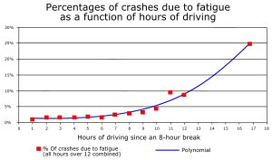 في بعض الحالات، بعد القيادة 18-24 ساعة بدون نوم تساوي محتوى الكحول في الدم بنسبة 0.05٪ -0.10٪.[30]