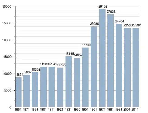 في سنة 1861 بلغ عدد السكان 8٬834 نسمة، وتطور العدد ليصل في سنة 2011 لـ 23٬592 نسمة.