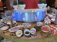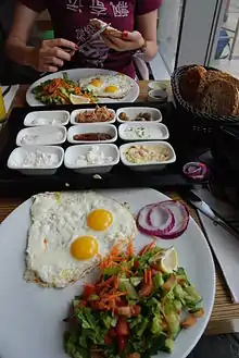 هناك أطباق عربية وشرق أوسطية أخرى قد تشمل السلطة العربية والحمص والطحينة والحلوم والفول المدمس وبابا غنوج واللبنة.[6] والخضروات الطازجة أيضاً خيار شائع، مثل الطماطم والخيار والفلفل الأخضر والفجل والبصل و الجزر المبشور والزيتون.[7] ويتم أيضاً توفير مجموعة متنوعة من السلطات.[8] وتكتمل قائمة الإفطار مع القهوة والشاي والعصائرالطازجة من الفواكه والخبز والمعجنات.