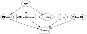 - ffmpeg هو أداة تعمل في سطر الأوامر لتحويل نسق فيديو إلى اخر. ويمكنه أيضاً جلب وترميز الفيديو من بطاق تلفاز أثناء البث.
