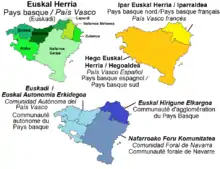 - إقليم الباسك الشمالي (ابارالدي[بحاجة لمصدر] (Iparralde)، المقاطعات الشمالية (التاريخية) الثلاث في فرنسا (الموضحة باللون الأصفر على الخريطة).