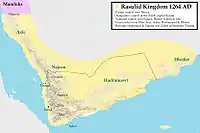 (بنو رسول) كانت سلالة مسلمة حكمت الجزء الجنوبي الغربي من بلاد اليمن في الفترة (626 – 858 هـ / 1229 – 1454 م)، أسسها عمر بن رسول [44] وأعلن استقلالها عن الأيوبيون في مصر، وأعلن نفسه ملكاً مستقلا بتلقبه بلقب "الملك المنصور".[45] يعتبر "العصر الرسولي" واحد من أزهى الفترات في بلاد اليمن، فقد أقروا الحرية المذهبية والدينية، [46] حتى الرحالة ماركو بولو أشاد باليمن خلال هذه الفترة ونشاطها التجاري والعمراني وكثرة القلاع والحصون بالبلاد، [47] فكان عهد دولة الرسوليين من أفضل العصور التي مرت على اليمن بعد الإسلام، [48] تم بناء قلعة القاهرة بتعز وجامع ومدرسة المظفر في عصرهم ولعدد من ملوكهم مؤلفات في الطب والصناعة واللغة.