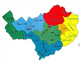 | التقسيمات الإدارية | بني تسيريس بوحمام تامدا جابرية كدية بني دغوغ كرديد الوليدية العامرية لعطاطرة الغنادرة أولاد بوساكن أولاد سبيطة أولاد سي بوحيى سيدي بنور امطل بني هلال العونات مطران العتاعتة مسناوة الطواهرة العجانة أولاد غانم الفراكنة اعزيب الحصبة أولاد الطيبي أولاد اسليمان أولاد سي احمد بن الطالب لهوانشية العزيب الفوقاني الوادات الحنيشات أولاد صالح أولاد يعلى مركز حد العونات الشدادنة الحصبة أولاد عيسى العوني أولاد رحمون زمامرة الغربية لحكاكشة الزواير المنادلة لعرابات الحفضان لقواولة العواوشة أولاد الطاهر سانية بركيك | |