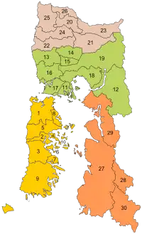 ينقسم إقليم لوس لاغوس إلى 4 مقاطعات (بالأسبانية: Provincia)؛ هي تشيلوي (باللون الأصفر)، يانكيوي (باللون الأخضر)، أوزورنو (باللون الرمادي)، وبالينا (باللون البرتقالي). وتنقسم هذه المقاطعات الأربع بدورها إلى 30 بلديّة (بالأسبانية: Comuna):