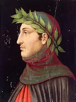 صورة للشاعر دانتي أليغييري واضعاً إكليل الغار على رأسه