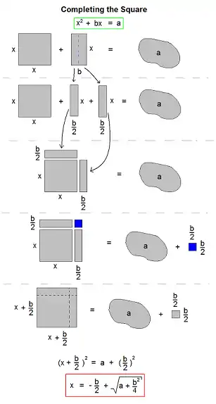 إذا حاولنا إنشاء مربعا كبيرا مكون من (المربع x2 ) و(المستطيل bx ) معا، سنجد أن هناك ركنا ناقصا يحتاج إلى إكماله. الحد الذي يتم إضافته إلى المعادلة يمثل مساحة هذا الركن الذي نحتاجه لإكمال المربع، ومن هنا جاءت التسمية إكمال المربع