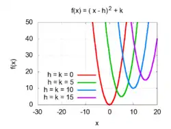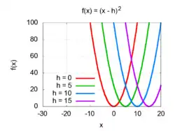 بينما رسم منحنى الدالة ƒ(x − h) = (x − h)2 هو قطع مكافئ تمت إزاحته جهة اليمين بالقيمة h ورأسه هي (h, 0) كما هو مبين بالشكل.