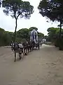 السفر إلى المحج يكون سيرا على الأقدام وعلى ظهور الخيل وفي عربات مزينة، والطريق الذي يمرون عبرها هي جزء من حديقة دونيانا، تمر القوافل تلوى الأخرى بعد الوصول إلى باب الكنيسة ويتلون بعض الأبيات والصلوات. يكتمل الحج حين يتم القفز من السياج وتبدأ المنافسة حول من يزخر بحمل لوح على هيئة السيدة العذراء مريم التي تسمى "الحمامة البيضاء"، وهو شرف يتنافس عليه أبناء قرية ألمونتي.