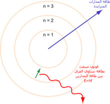 بإمكان الإلكترونات التنقل خلال المدارات المختلفة وذلك عن طريق بعث أو امتصاص فوتونات بطاقة تتوافق مع اختلاف الجهد.[105] وهناك طرق أخرى للتنقل المداري مثل التصادم مع الإلكترونات وأيضا تأثير أوجيه.[106] ولكي يتمكن الإلكترون من الهروب من الذرة، فإن طاقته يجب أن تكون أعلى من طاقة ربطه بالذرة. وهذا يحدث مع التأثير الكهروضوئي كمثال حيث يمتص الإلكترون الفوتون الخارج الذي تجاوز طاقة تأين الذرة.[107]