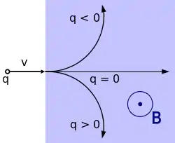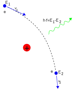يخضع الإلكترون لقوة لورنتز عندما يتحرك داخل مجال مغناطيسي فيمارس عليه تأثيرا عموديا على مساره الذي حدده المجال المغناطيسي وسرعة الإلكترون. وتوجه قوة الجذب تلك الإلكترون بأن ينحو بمسار حلزوني خلال حقل في دائرة يسمى نصف قطرها باسم نصف قطر الجيرو (gyroradius). يحرض هذا التسارع من حركة التقوس الإلكترون بأن يشع طاقة على شكل إشعاع سنكروتروني.[93][94][معلومة 6] وتسبب انبعاث الطاقة بدورها في ارتداد الإلكترون والمعروفة باسم قوة لورنتز-أبراهام-ديراك مما يخلق احتكاكا يبطئ الإلكترون. وسبب تلك القوة هو التفاعل العكسي لمجال الإلكترون على ذاته.[95]