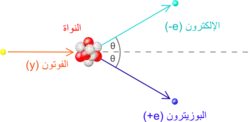 يسمى الاصطدام المرن بين فوتون (الضوء) والكترون منفرد (حر) باسم تأثير كومبتون. نتائج هذا الاصطدام هو نقل الزخم والطاقة بين الجسيمات فيتعدل الطول الموجي للفوتون بمقدار يسمى انزياح كومبتون[معلومة 7] إن حجم الحد الأقصى لهذا الانزياح في الطول الموجي هو h/mec، الذي يعرف باسم طول موجة كومبتون.[98] القيمة لدى الإلكترون هي 2.43×10−12 م[66]، فإن كان الطول الموجي للضوء طويلا (على سبيل المثال، الطول الموجي للضوء المرئي هو 0.4–0.7 ميكرومتر) فإن انزياح الطول الموجي يكون ضئيلا. ويسمى هذا التفاعل بين الضوء والإلكترونات الحرة تشتت تومسون الخطي أو تشتت تومسون.[99]