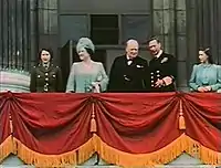 وبعد انتهاء الحرب وفي يوم الاحتفال بانتصار أوروبا، تنكرت الأميرتان إليزابيث ومارجريت واختلطتا مع الحشود التي كانت تحتفل في شوارع لندن. ولاحقا، صرحت إليزابيث في مقابلة نادرة لها: "لقد طلبنا من والدينا السماح لنا بالذهاب لنشاهد الاحتفالية بأعيننا. وأتذكر أننا كنا مرعوبتين لو أن تعرف علينا أحد... كما أتذكر أيضا طوابير من أناس غير معروفين كانوا يربطون الأسلحة ويسيرون في شارع وايت هول، كل ما فعلناه هو أننا فتحنا لهم الطريق وأخذنا ننظر إليهم بسعادة غامرة وارتياح."[51]