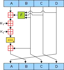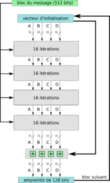تمرّ كل حزمة من البيانات بِأربع جولات (4 rounds) متتالية، تتكوّن كل جولة منها من 16 خطوة. نستخدم في كل خطوة جدولاً مُكوّنًا من 64 خانة T[1 ... 64] يتم حسابها عن طريق دالّة sine وتساوي T[i]= 4294967296 times aps(Sin(i)) حيث تحسب i بالراديان.