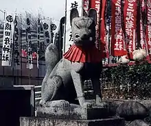 تمثال كيتسونه مربوط على عنقه قربان أحمر اللون على مدخل معبد قلعة إنوياما.