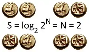 حيث b هي أساس اللوغاريتم المستخدم. القيم الشائعة لـ b هي 2 ، رقم أويلر e ، و 10 ، والوحدات المقابلة من الإنتروبيا هي البتات لـ b = 2 ، nats لأجل b = e، bans لـ b = 10. [7]