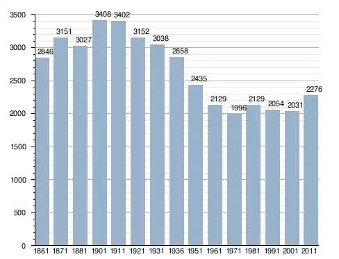 في سنة 1861 بلغ عدد السكان 2٬846 نسمة، وتطور العدد ليصل في سنة 2011 لـ 2٬276 نسمة.