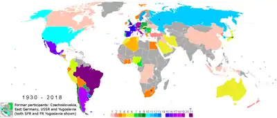 في المجموع 85 دولة مختلفة (بعض منها كانت تمثل دولة واحدة في حقب مختلفة، وأخرى شاركت تحت اسم مختلف) شاركت في نهائيات كأس العالم. بالنسبة لسنة 1950 فالدول بين العارضتين تأهلت لكأس العالم ولكنها أعلنت انساحبها لأسباب مختلفة. (انظر قائمة الملاحظات) كل نسخة كانت تعرف ظهور منتخب واحد جديد على الأقل كما يُظهر الجدول التالي: